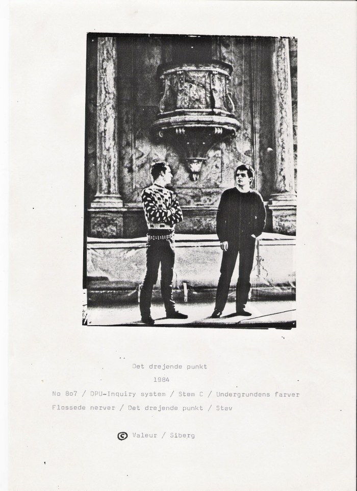 Det drejende punkt” blev til på initiativ af pladebutikken Ziggy, der tog sig af at udgive små uafhængige undergrundsproduktioner. Vi havde på det tidspunkt lige optrådt på Roskilde festivalens næststørste scene, i Falkoner teatret foran rigtigt mange mennesker. Filmen “Totem” var blevet udgivet og vi havde været i tv et par gange. Med andre ord var det ikke længere kun de små scener vi optrådte på, Irmgards var ikke interesseret i endnu et projekt og ingen af pladeselskaberne turde rigtigt kaste sig ud i noget. Der var meget respekt når vi sendte noget ind – de var nysgerrige over hvordan vi lavede musikken. Vi samplede og lagde et enkelt beat på – samtidigt med at stemmen læste hurtigt og rytmisk op… og den slags ville ingen påtage sig at sælge. (Det var før hip hoppen). Titel digtet blev ledsaget af rent samplede sekvenser fra forskellige klassiske plader – så der læser jeg op for fuldt symfoniorkester. Men ellers benytter vi et gammelt harmonium, Jespers elskede PPG, rytme spor lavet af knuste flasker, repeterende stemmer, flamingo i halv hastighed og rytmebokse.