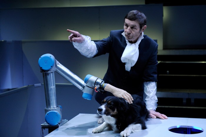 I forestillingens første scene træder vores forelæser ind med en hund, som han lægger på bordet og lader kærtegne af en robotarm. Han spørger publikum: “Ved hunden at den bliver kærtegnet kunstigt? Og hvad betyder det for i givet fald for den?” Og så er forestillingen i gang.
