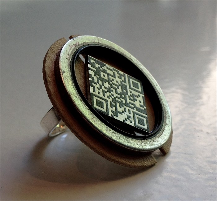 Smykket er en ring, der er bygget op omkring en QR-kode. Når ringen scannes dukker et af mine digte op på telefonens skærm, ledsaget af et stykke af Jesper Sibergs musik.